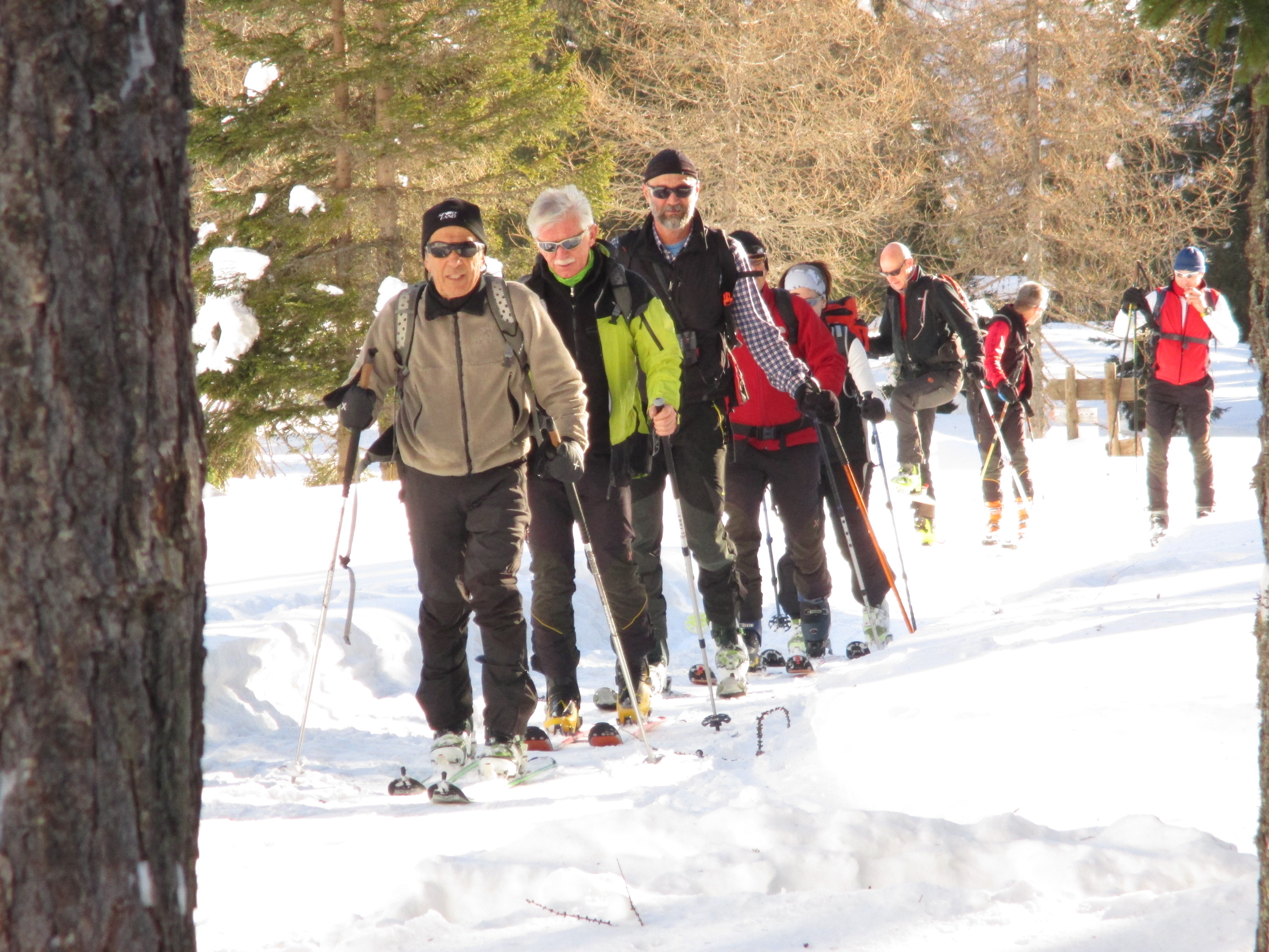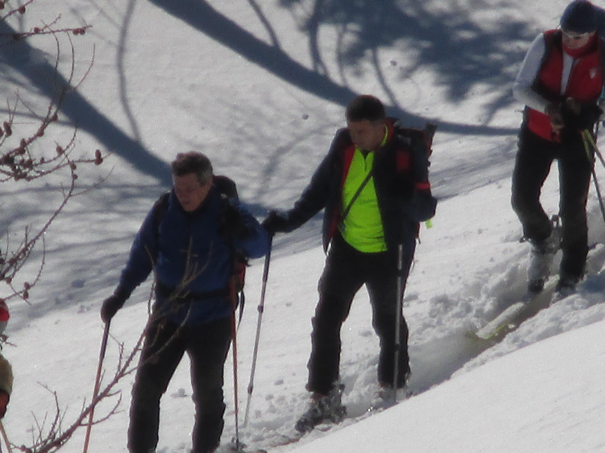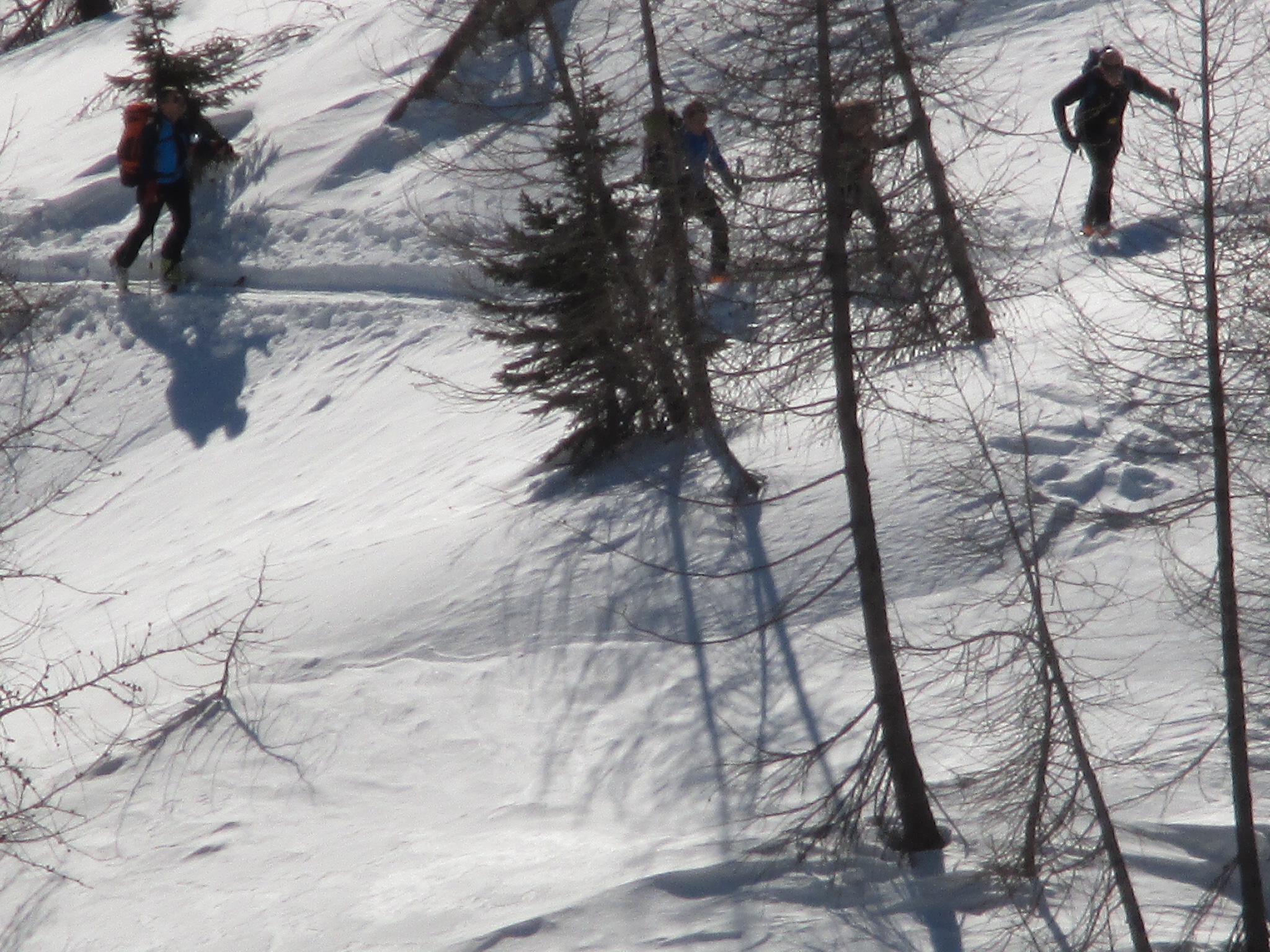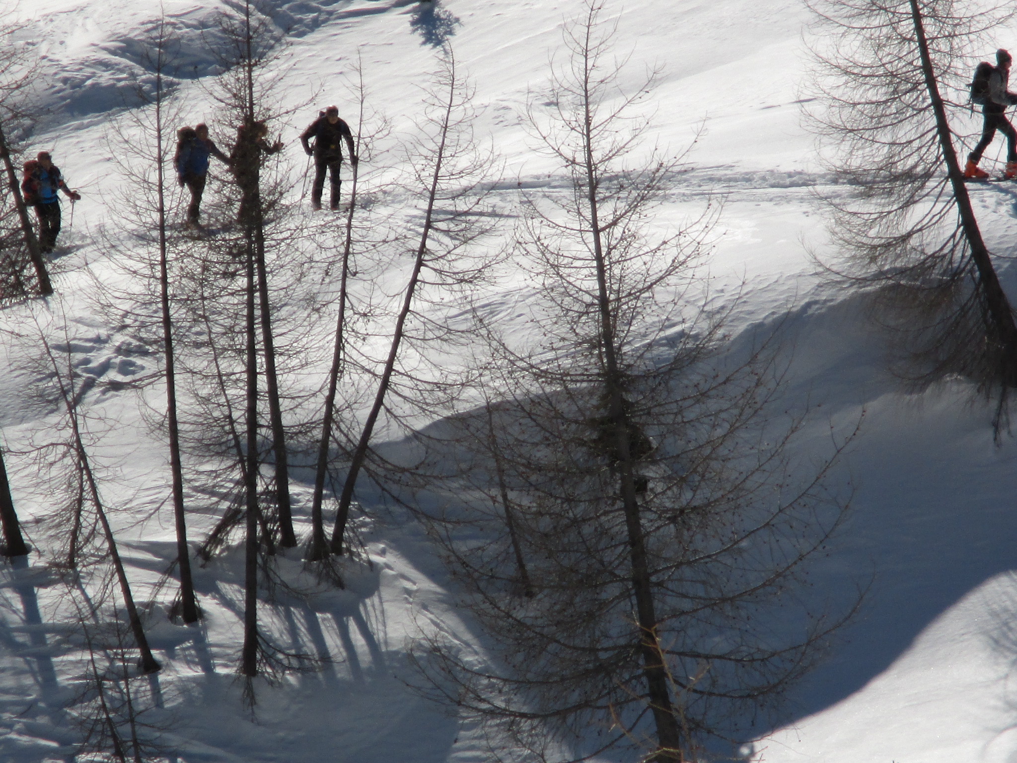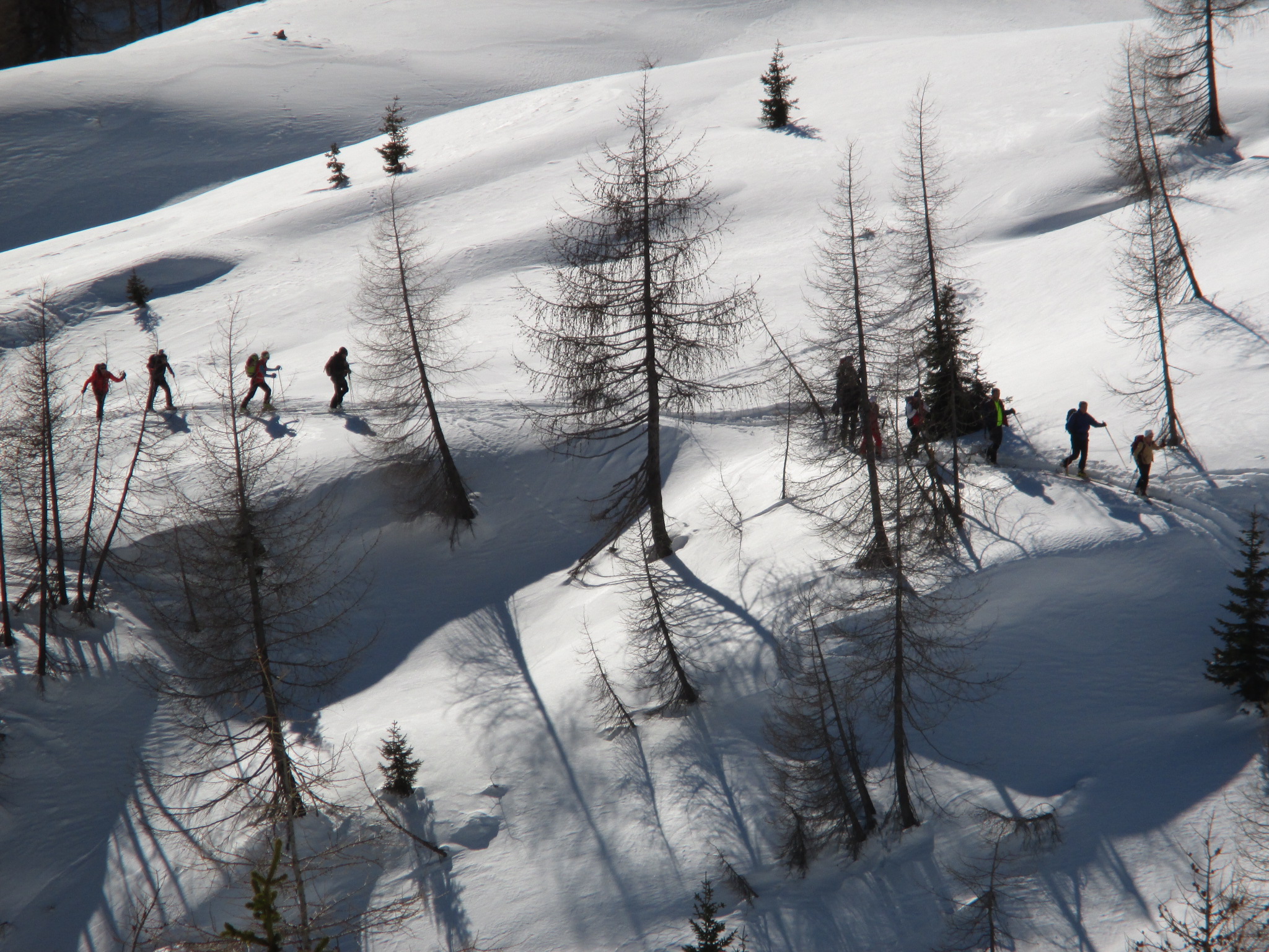 Il forte vento non ha impedito al manipolo di arditi di risalire l’erto pendio e, gratificato dalla conquista e da un panorama favoloso, di scrivere sul candido mando tracce di discesa che sembrano vergate con il compasso!