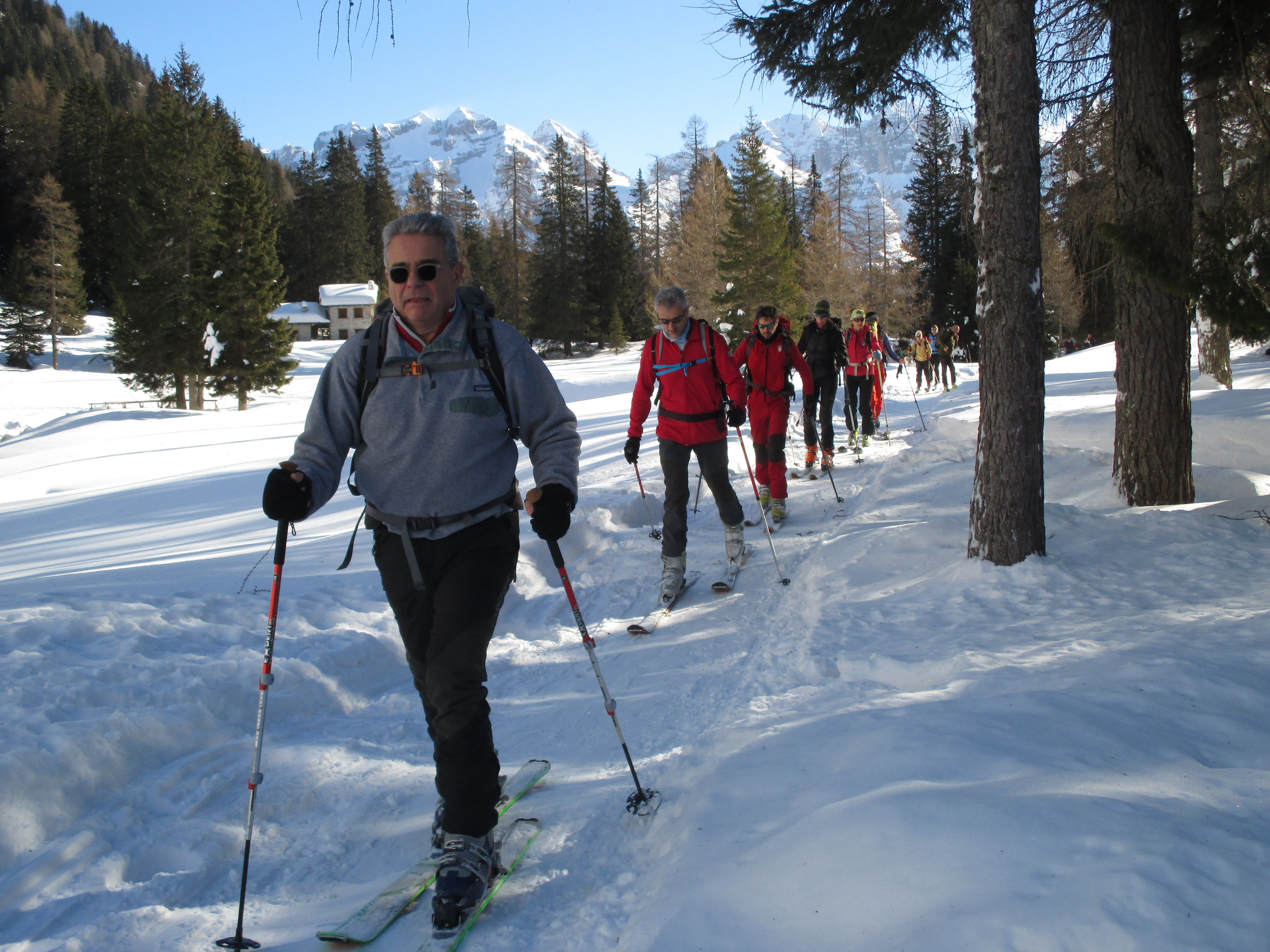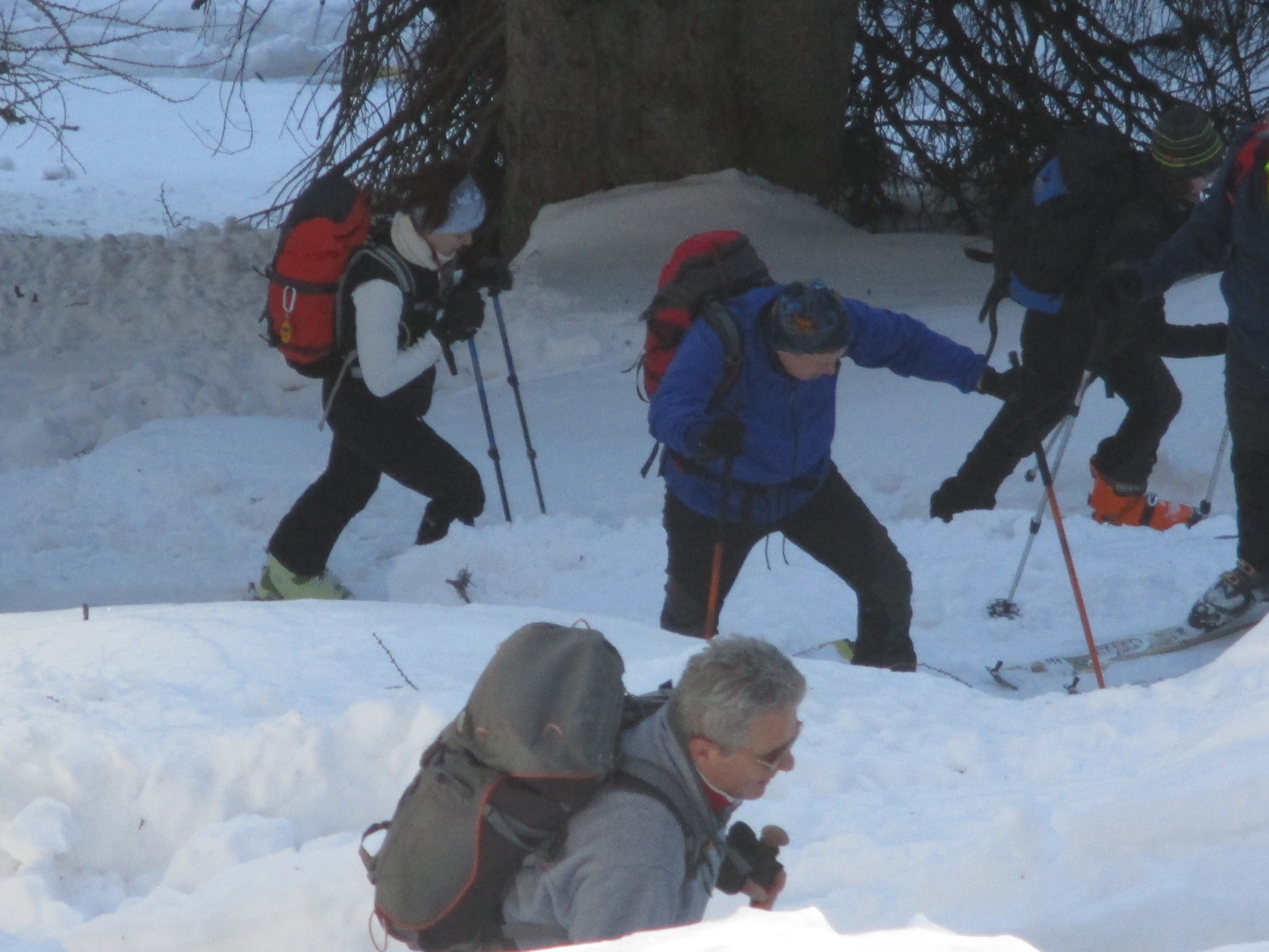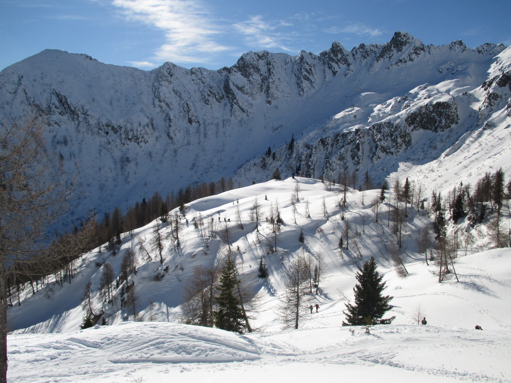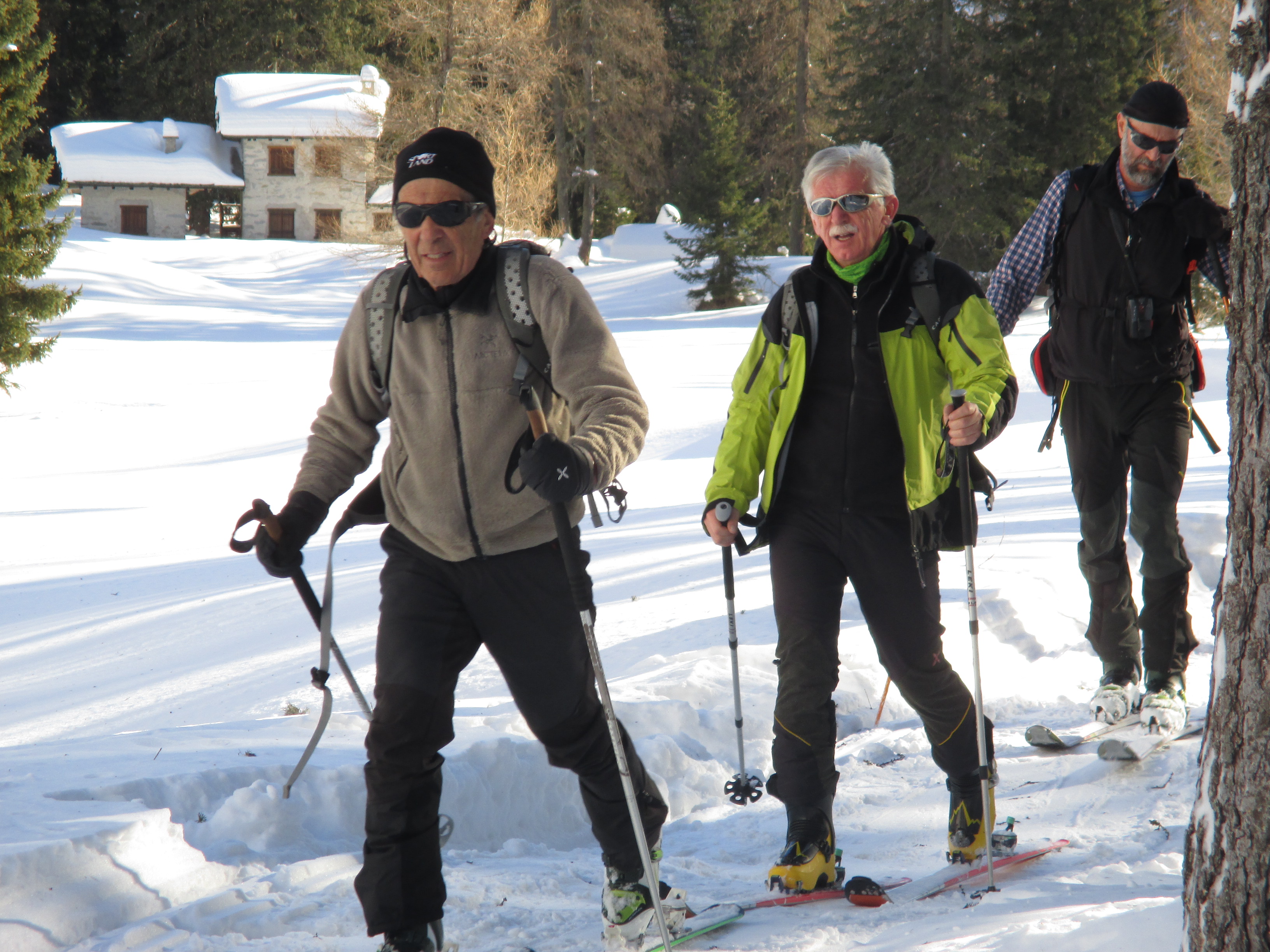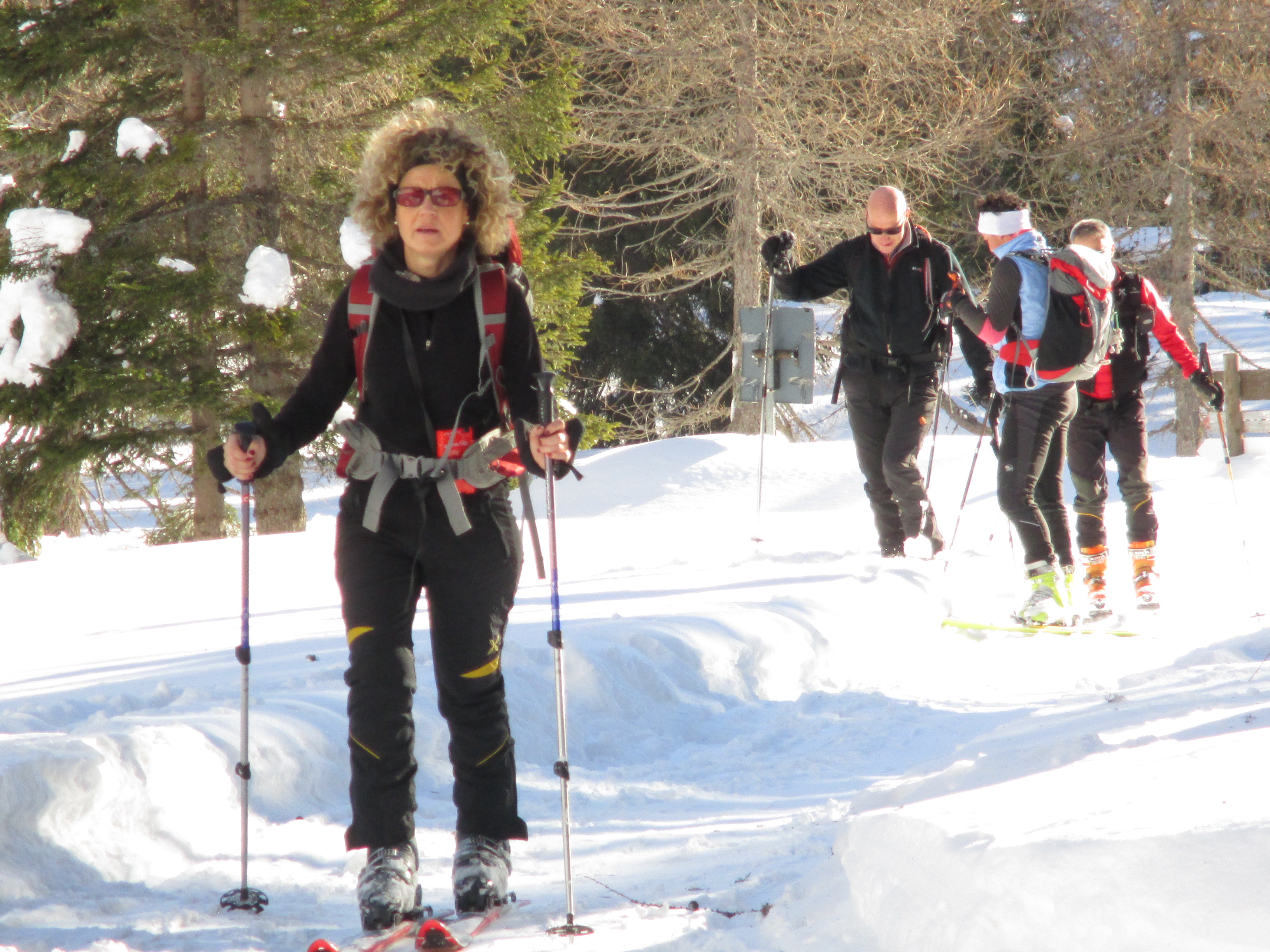 Il forte vento non ha impedito al manipolo di arditi di risalire l’erto pendio e, gratificato dalla conquista e da un panorama favoloso, di scrivere sul candido mando tracce di discesa che sembrano vergate con il compasso!