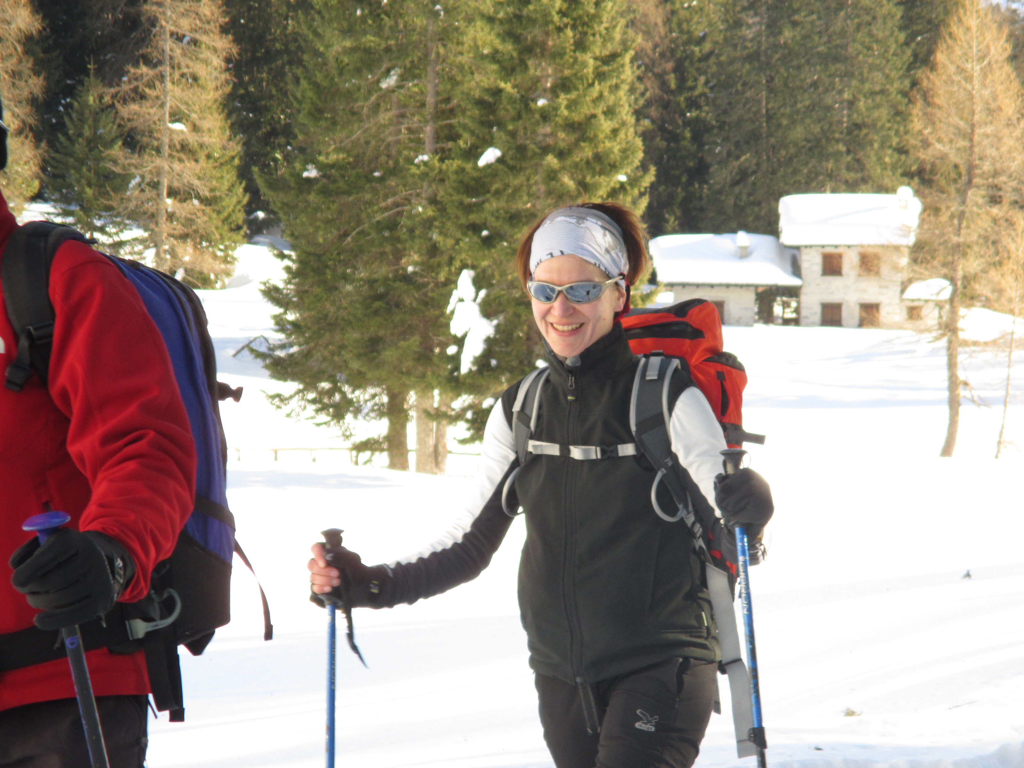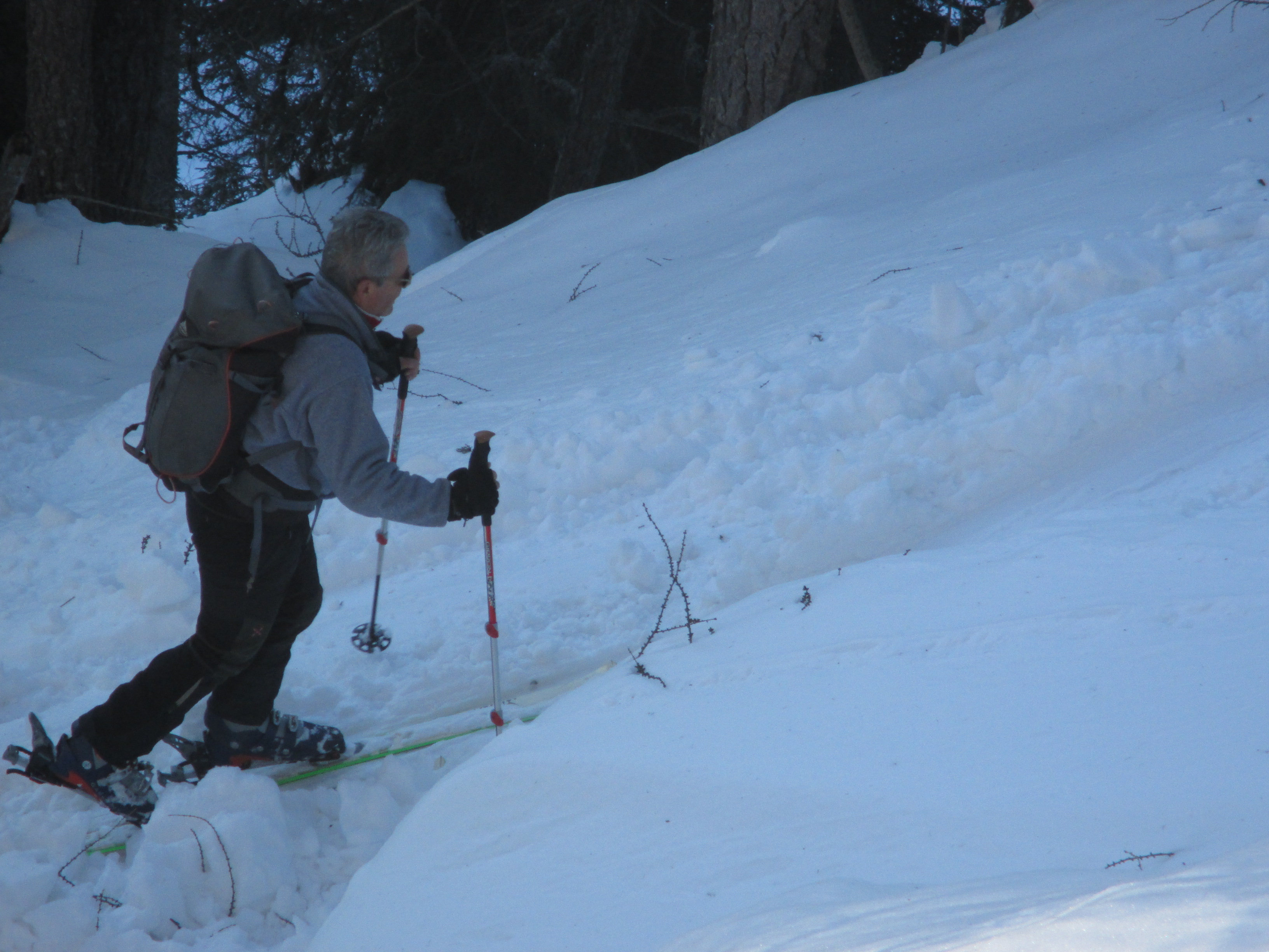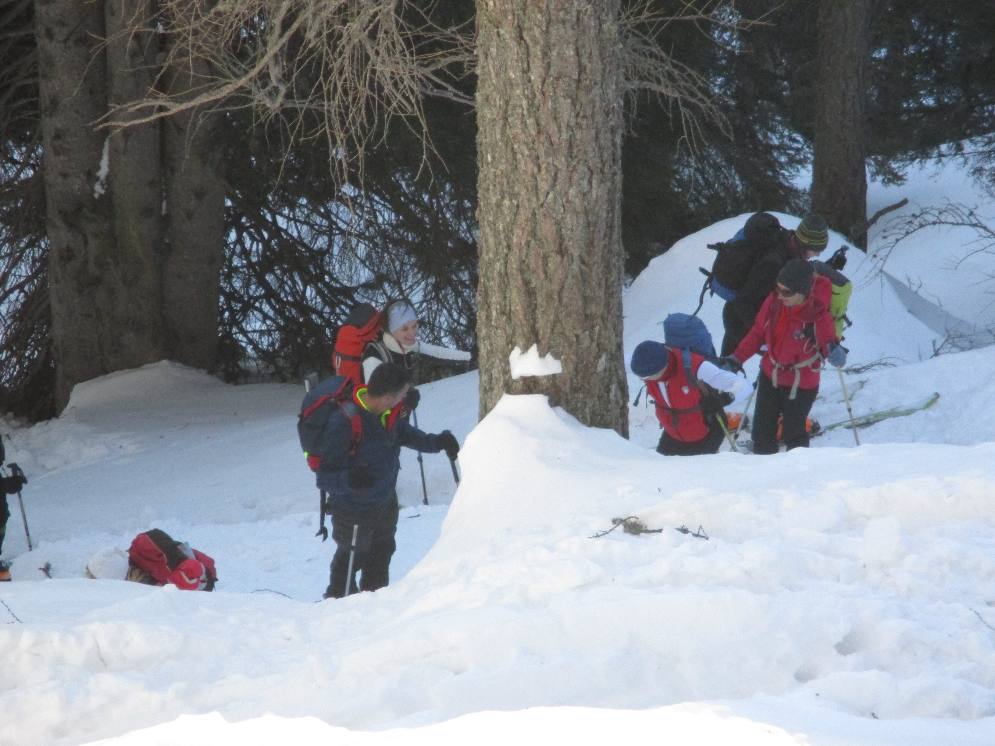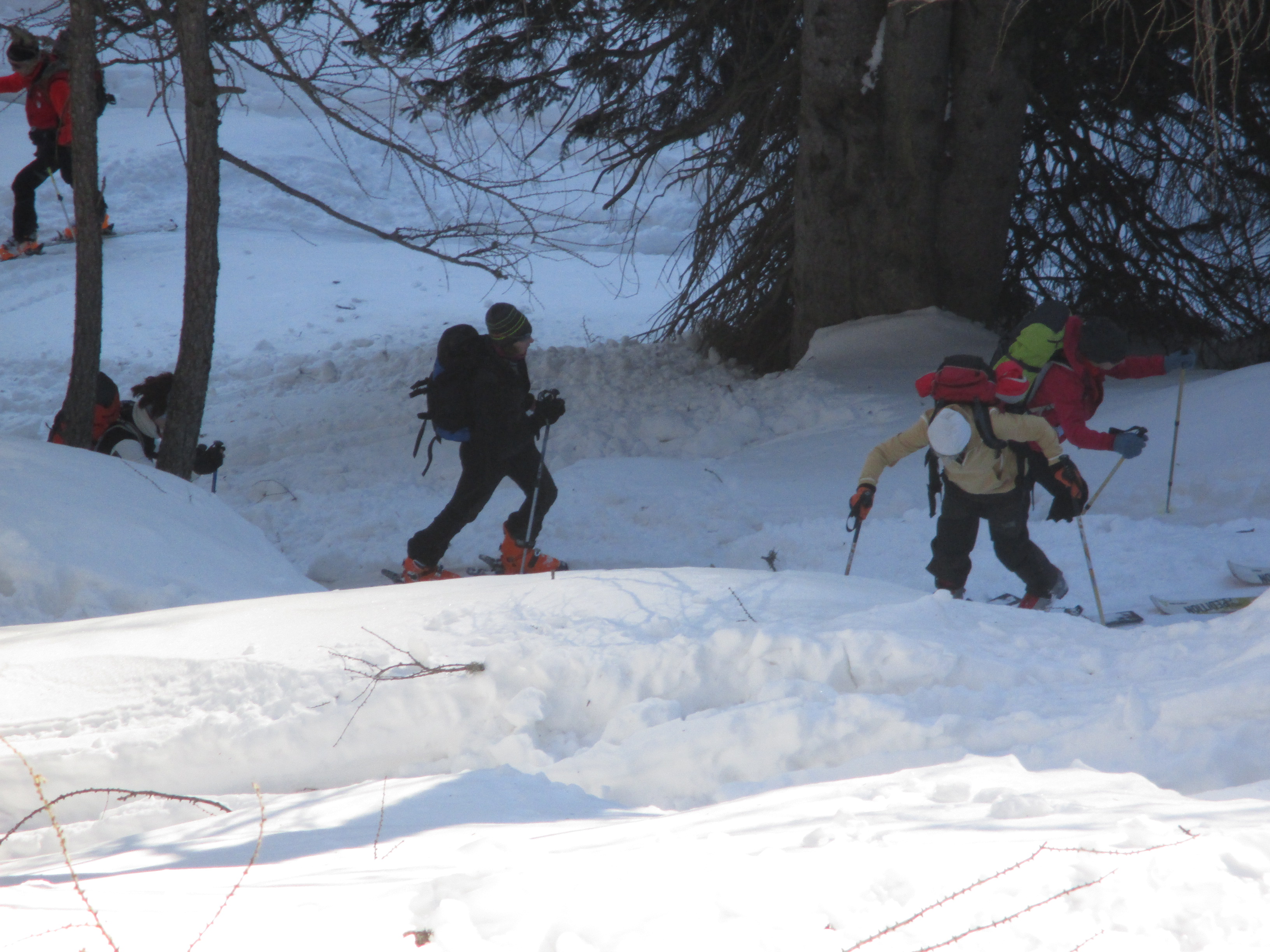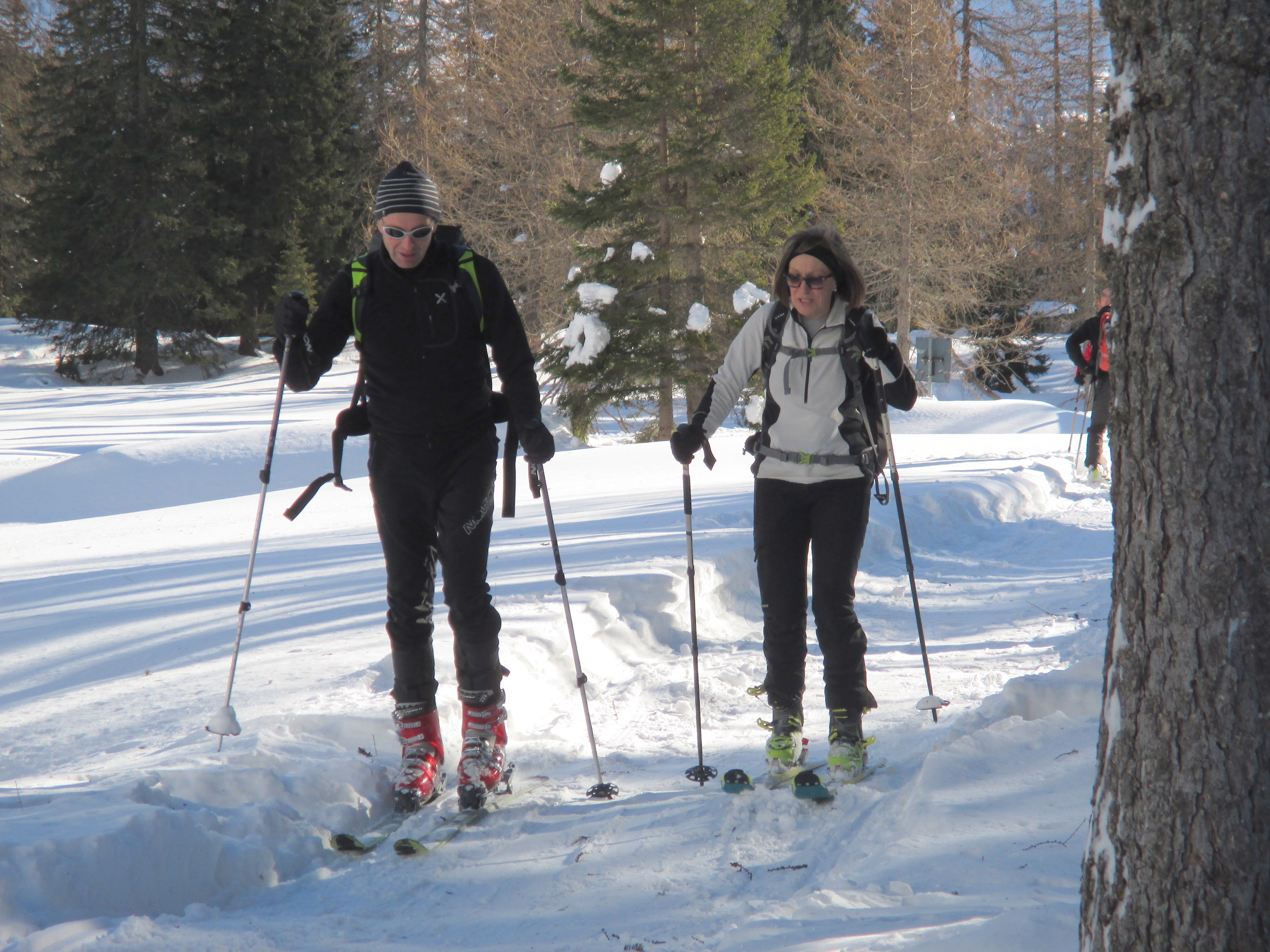 Il forte vento non ha impedito al manipolo di arditi di risalire l’erto pendio e, gratificato dalla conquista e da un panorama favoloso, di scrivere sul candido mando tracce di discesa che sembrano vergate con il compasso!
