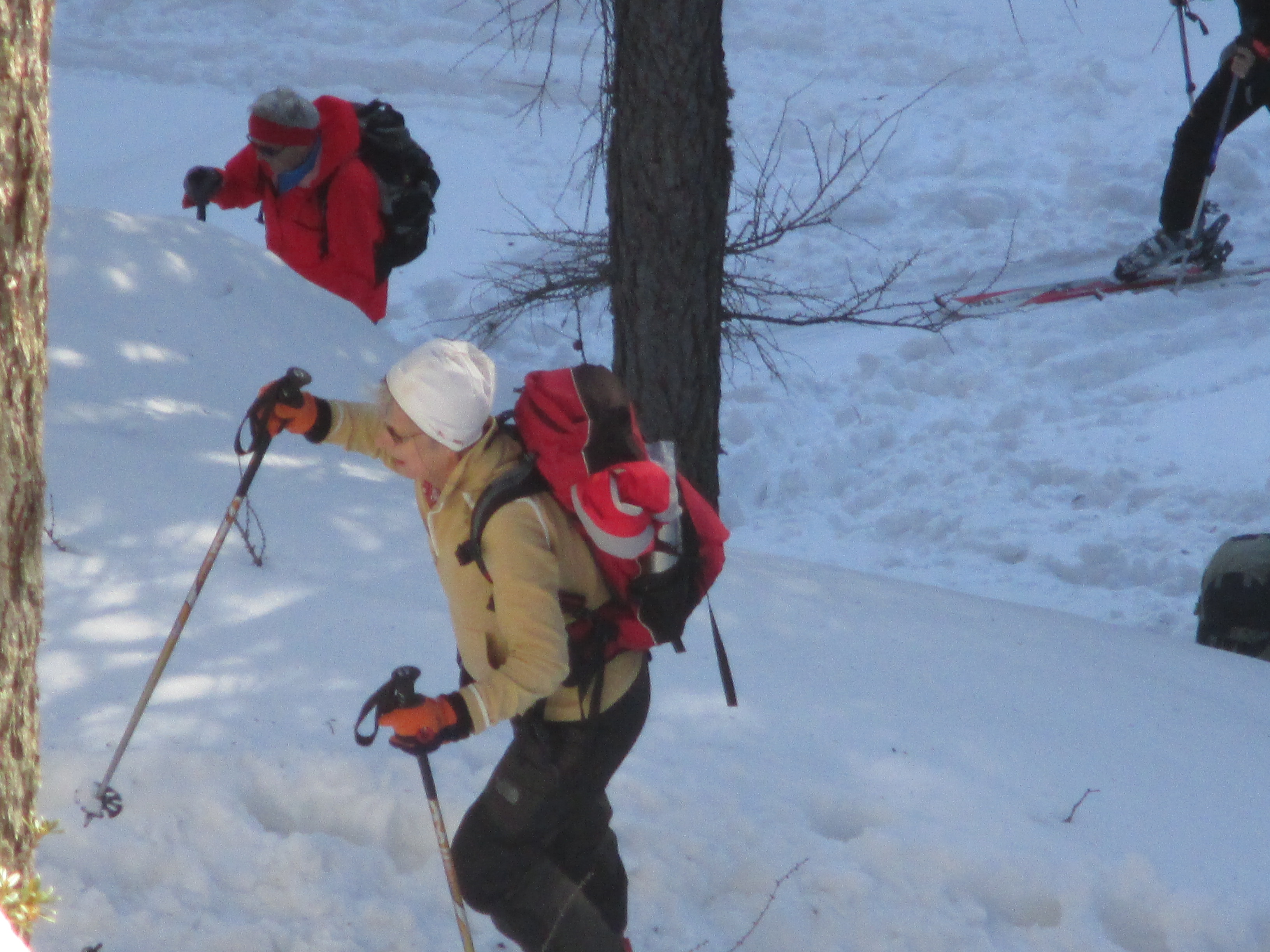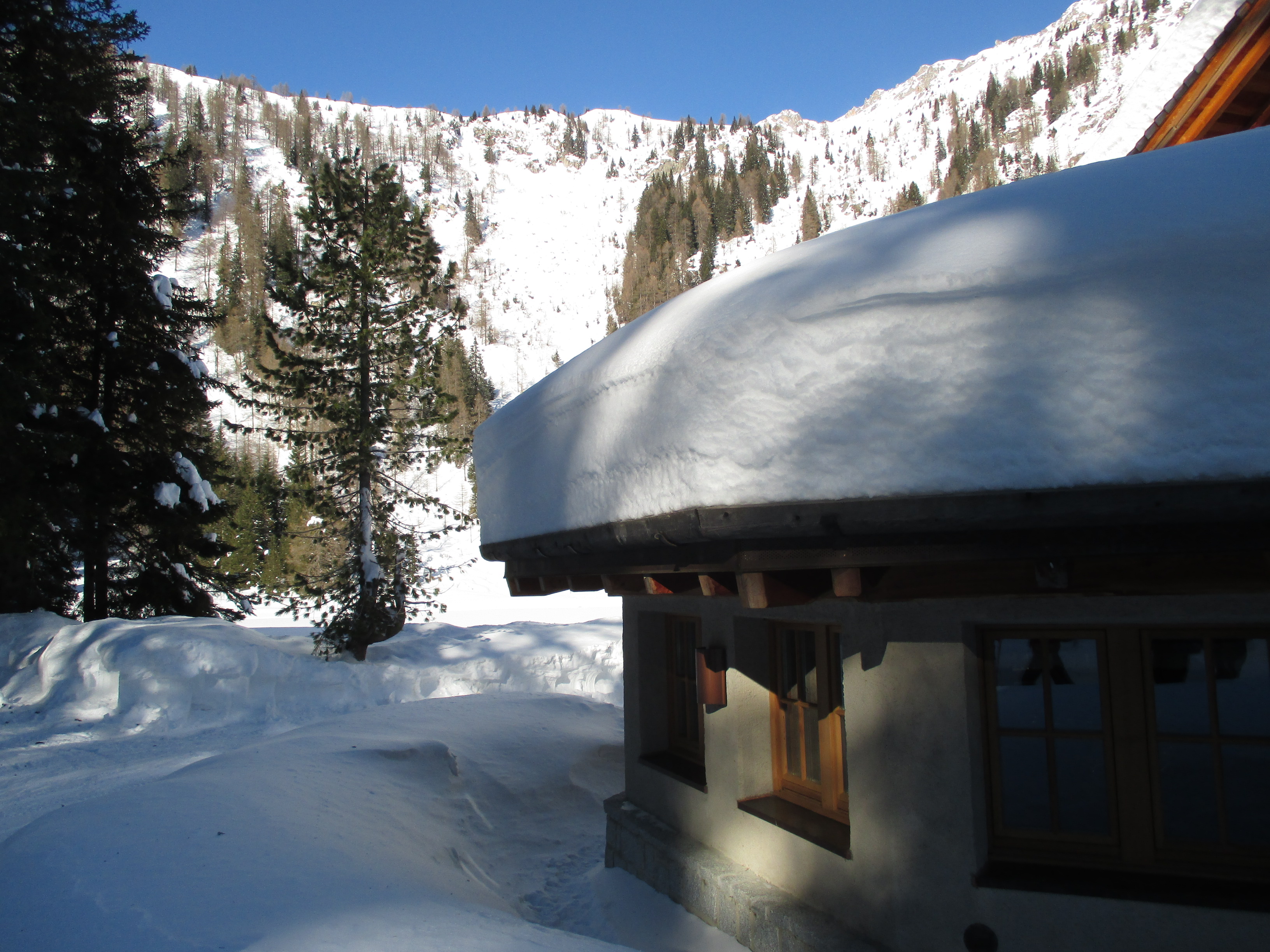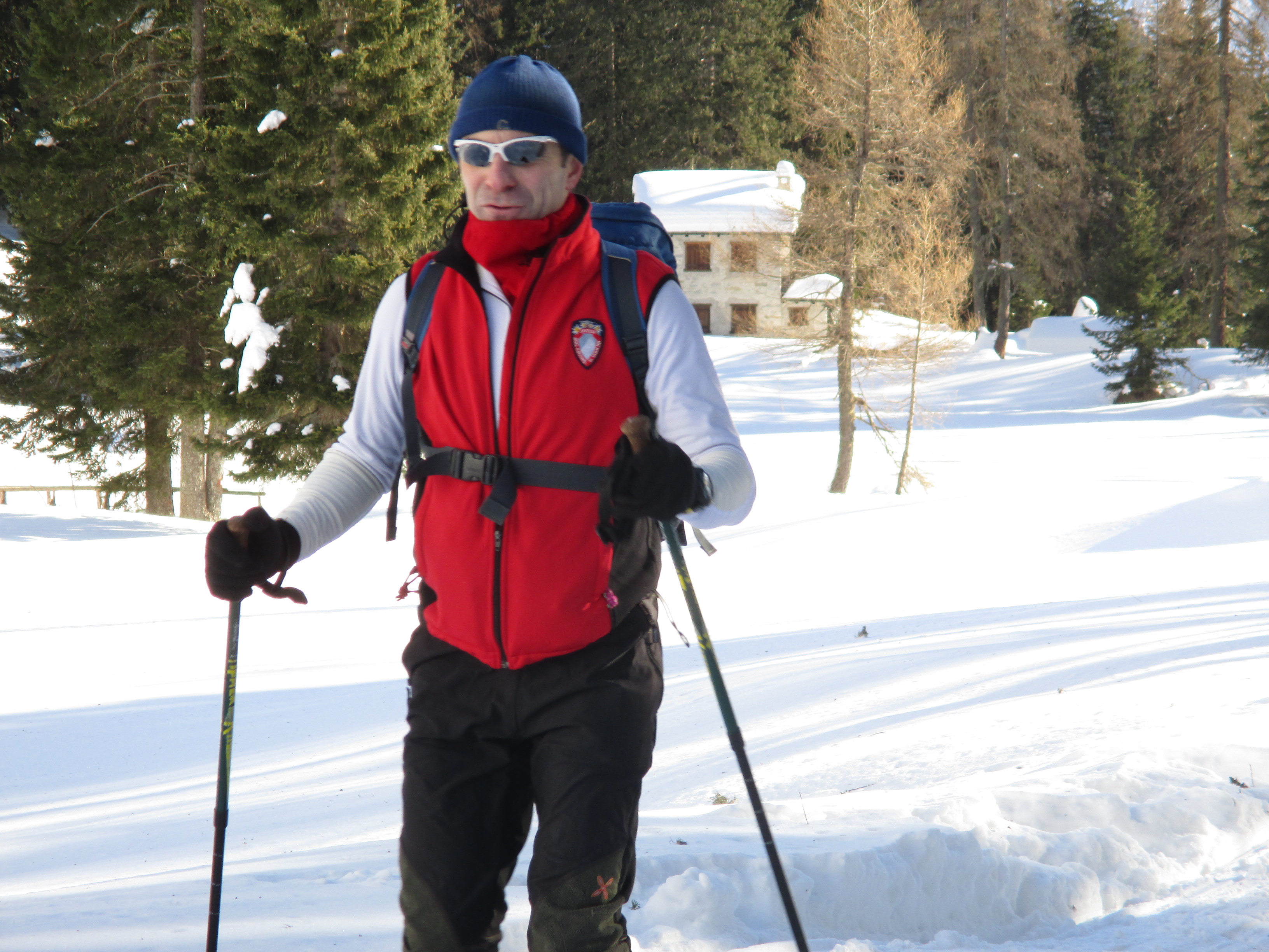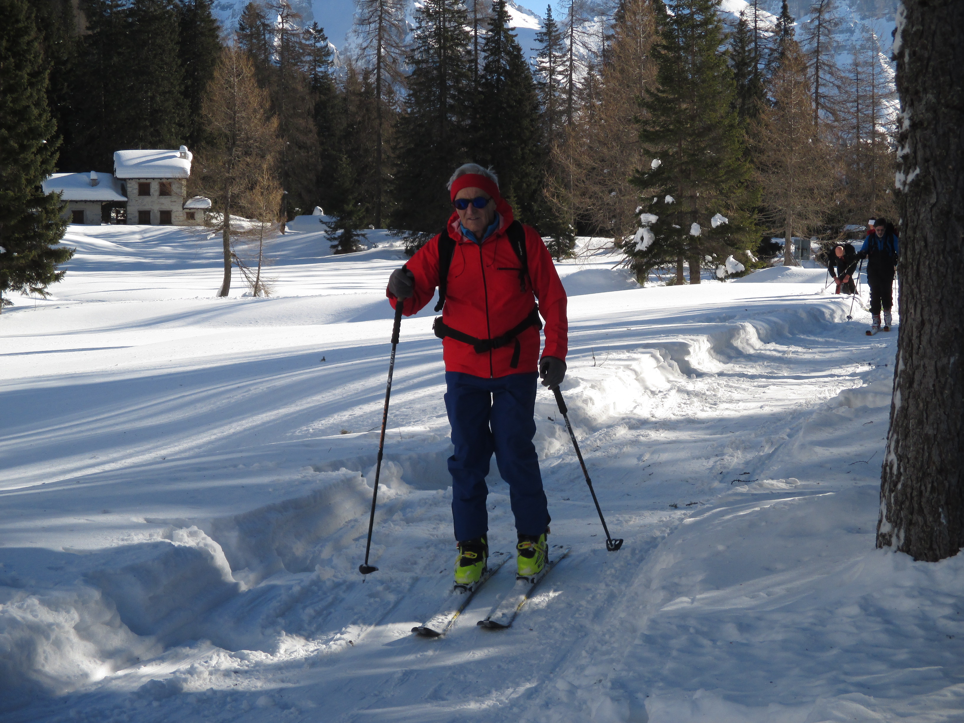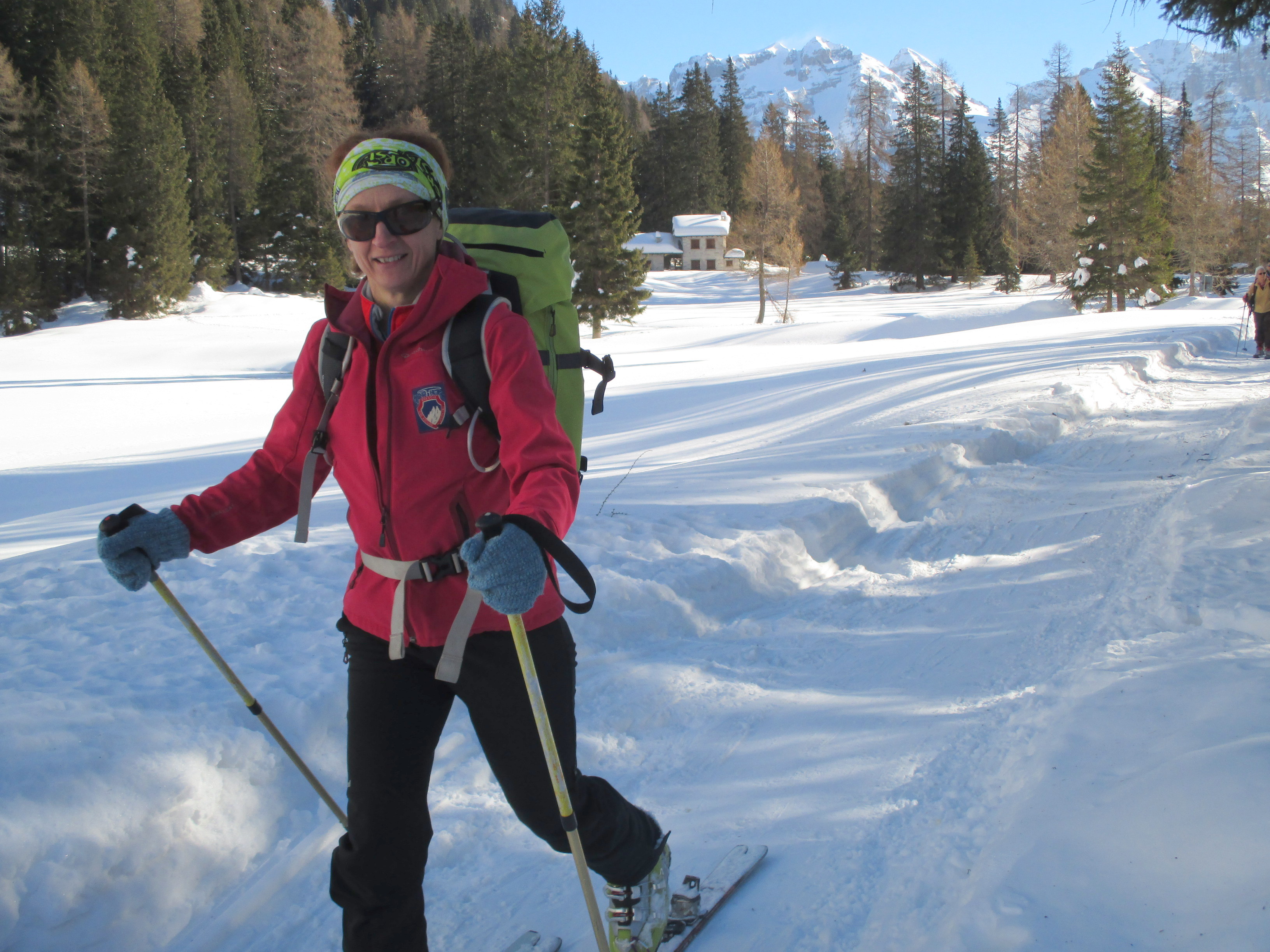 Il forte vento non ha impedito al manipolo di arditi di risalire l’erto pendio e, gratificato dalla conquista e da un panorama favoloso, di scrivere sul candido mando tracce di discesa che sembrano vergate con il compasso!