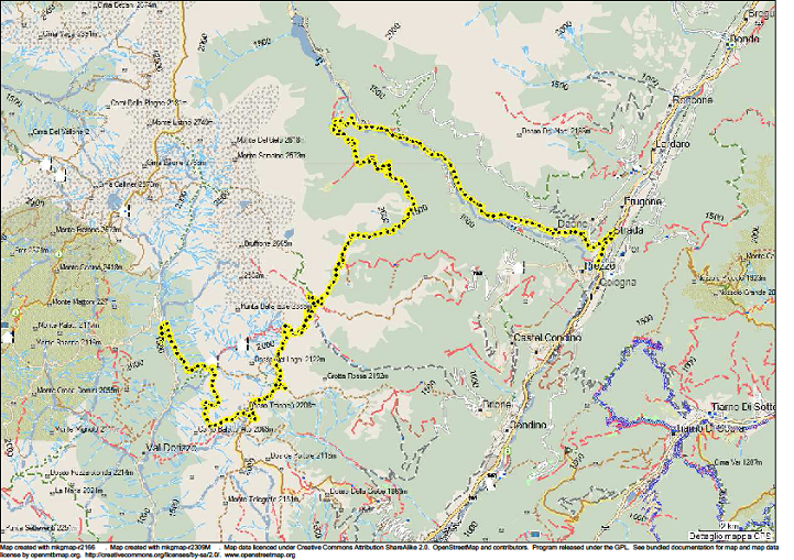 Si attraversa il torrente Giulis su ponte in legno e si interseca la strada sterrata che risale la Val Aperta, segnavia Cai 258 direzione Sella di Bondolo. Si segue la sterrata per pochi metri perché subito la si abbandona prendendo la prima a destra in direzione Sella di Bondolo; con pendenza costante su stradina forestale con fondo erboso giungiamo alla sella (mt. 1.944). Lì si consiglia di proseguire dritti lungo il segnavia CIA 258 (direzione Casinei di Nova) che ci permette di percorrere una rilassante strada sterrata sino alla Malga Clef. Dalla sella si potrebbe anche seguire il segnavia 251 in direzione Lago di Casinei, cosa che sconsigliamo perché poco ciclabile.